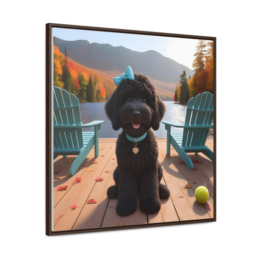 Black Doodle on Dock by Lake - Wooden Gallery Canvas Picture - Square Frame - Nice!