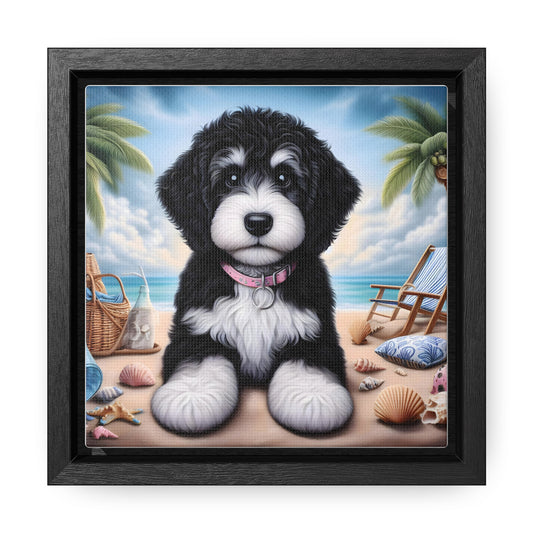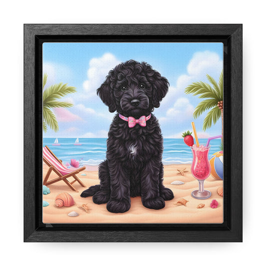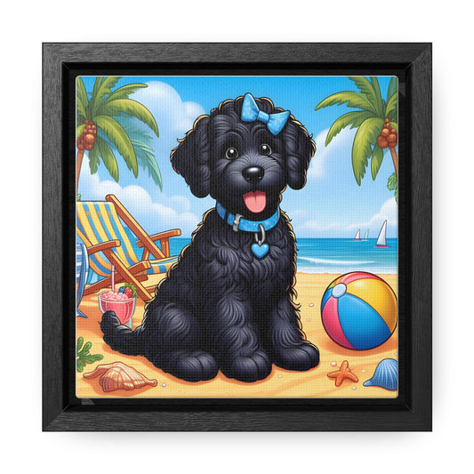 Black & White Doodle Puppy on Beach - Wooden Gallery Canvas Picture - Square Frame - Nice!