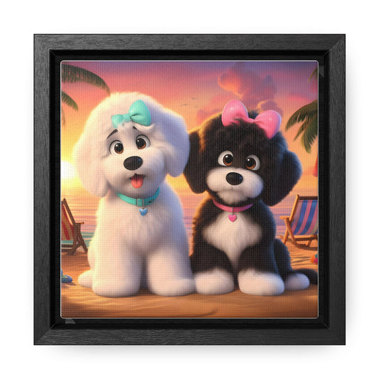 Doodle Puppies on Beach, Cartoon Inspired - Wooden Gallery Canvas Pictures - Square Frame - Nice!