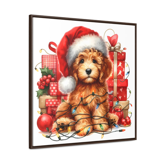Christmas Lights Chocolate Doodle Puppy - Wooden Gallery Canvas Square Frame - Nice!