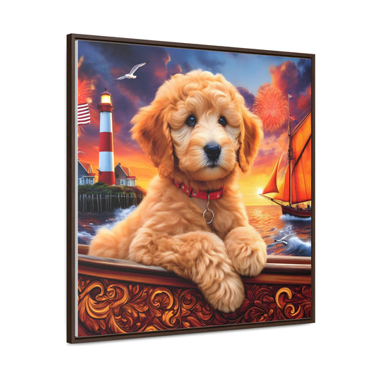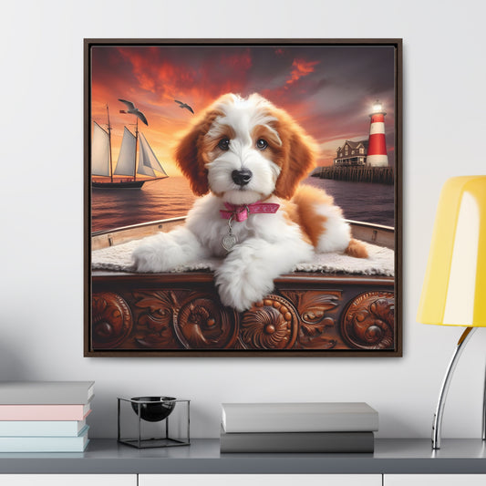 Apricot Doodle on Sailboat - Wooden Gallery Canvas Picture - Square Frame - Nice!