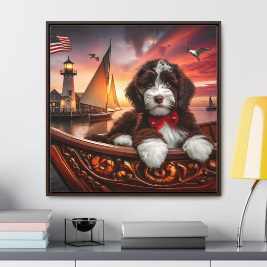 Brown and White Bernedoodle on Sailboat - Wooden Gallery Canvas Picture - Square Frame - Nice!