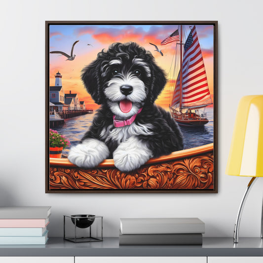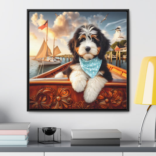 Bernedoodle on Sailboat - Wooden Gallery Canvas Picture - Square Frame - Nice!