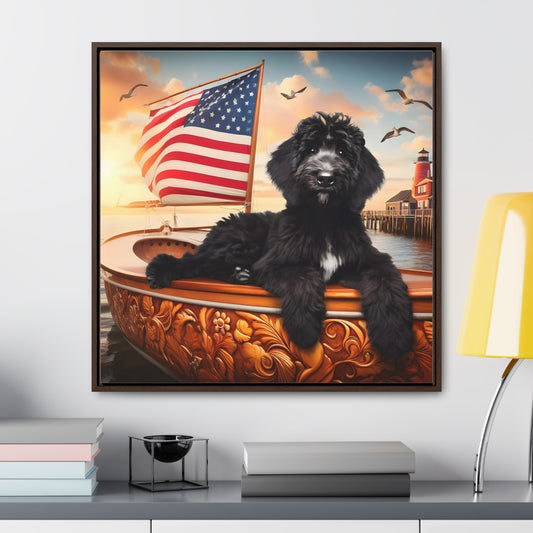 Black Doodle on Sailboat - Wooden Gallery Canvas Picture - Square Frame - Nice!