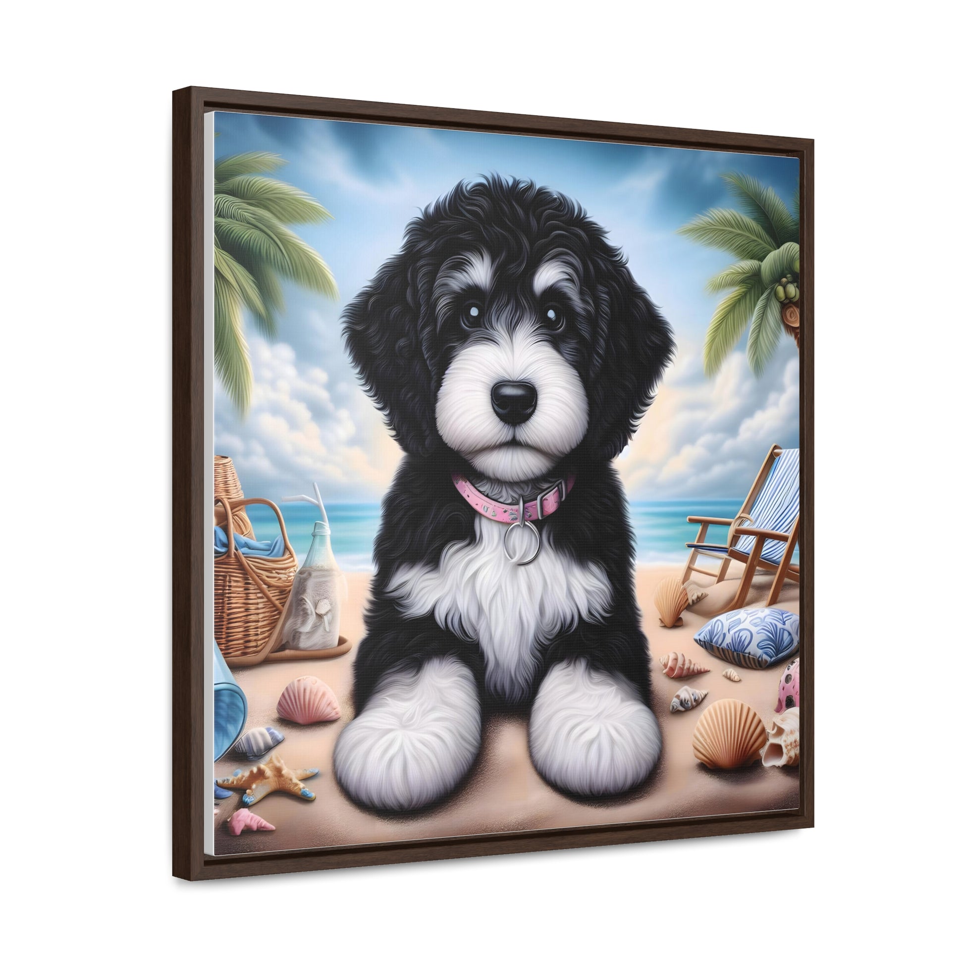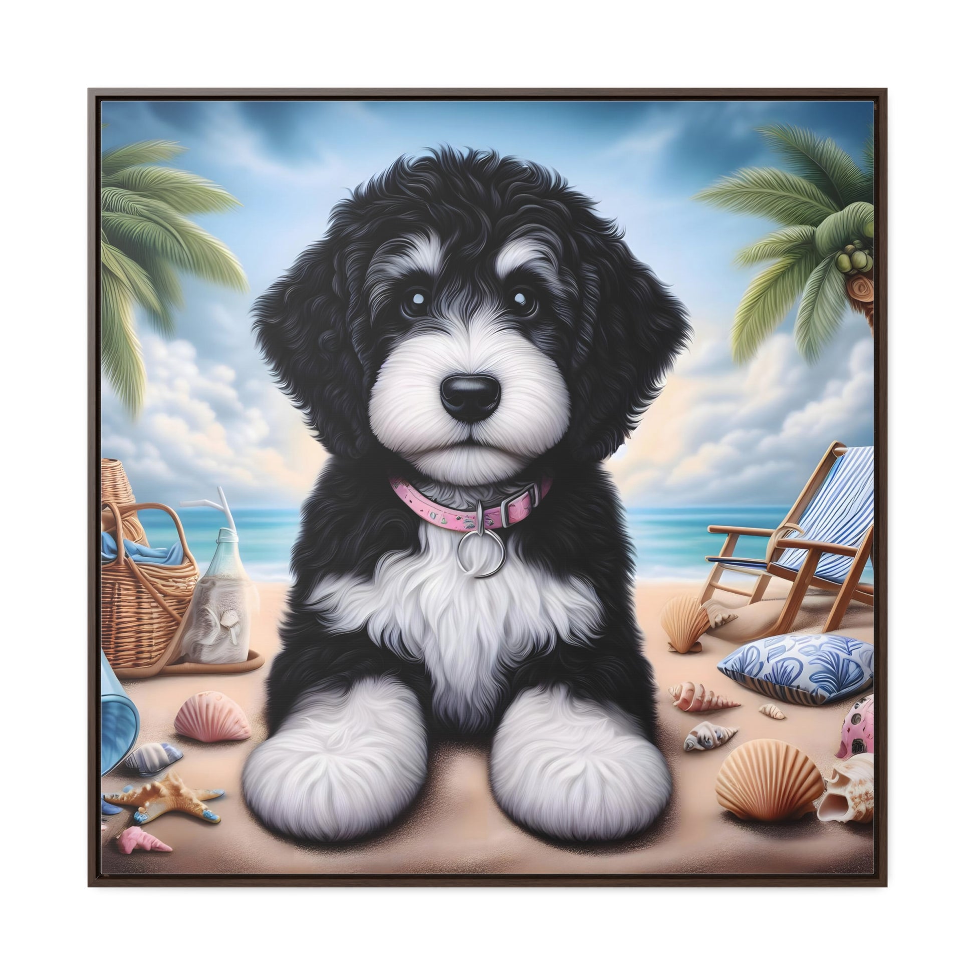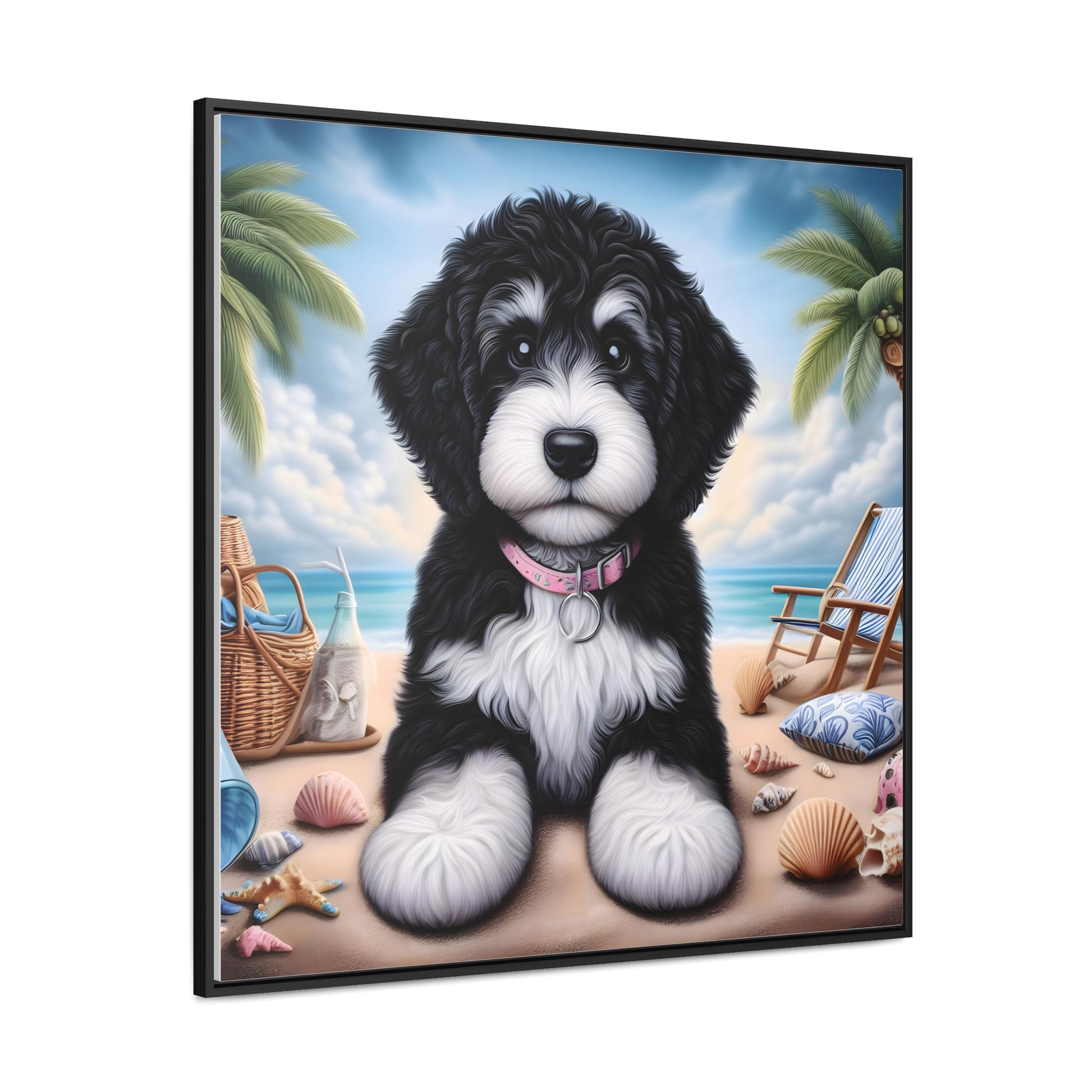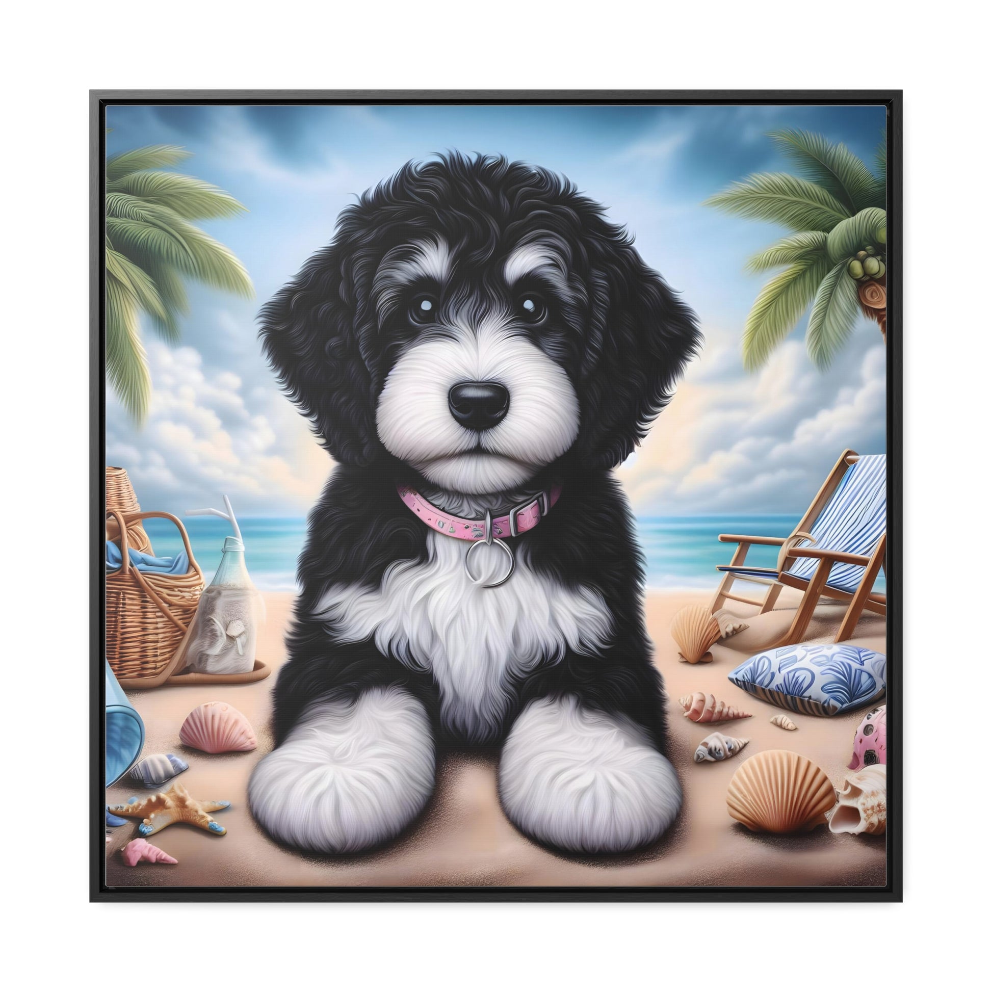 Black & White Doodle Puppy on Beach - Wooden Gallery Canvas Picture - Square Frame - Nice!