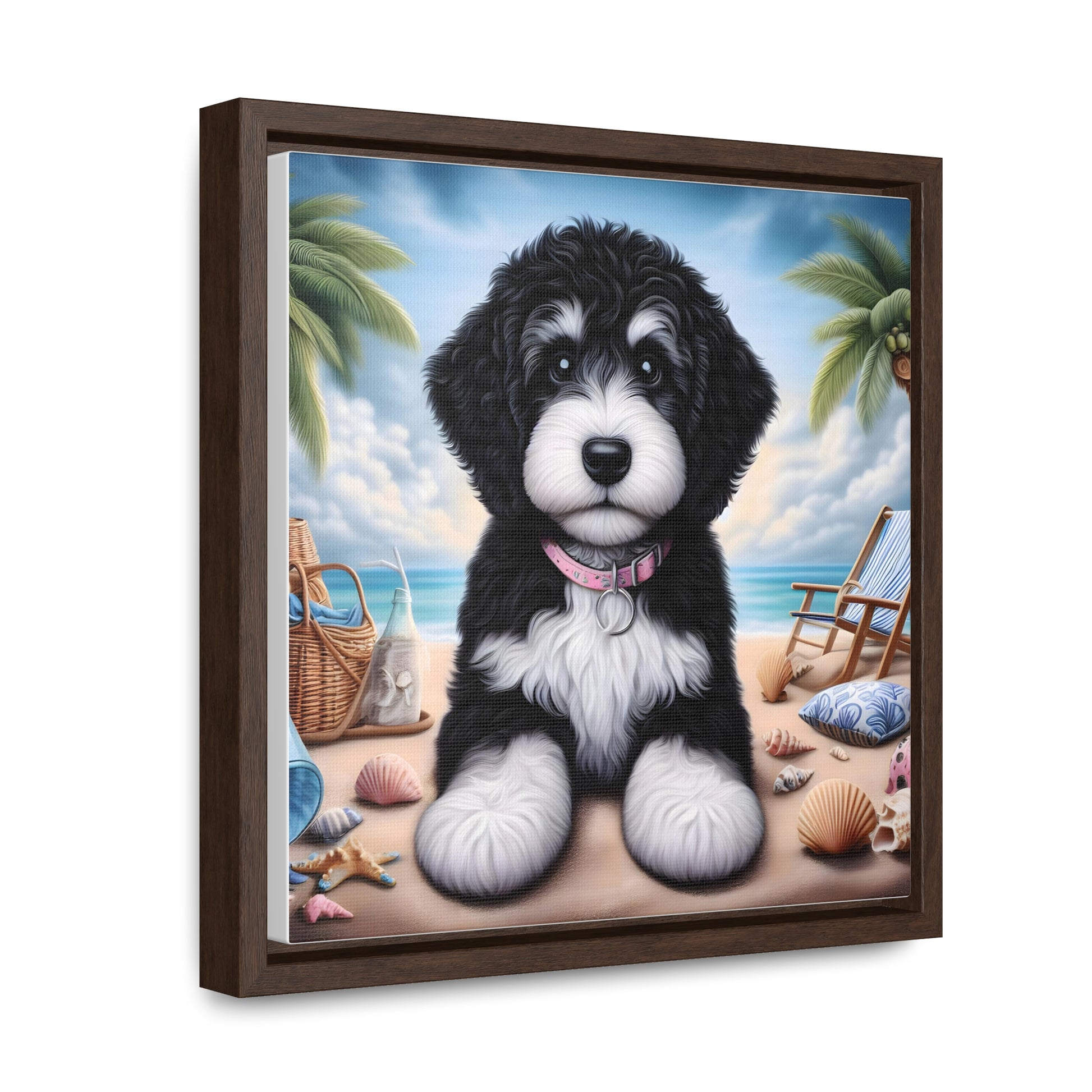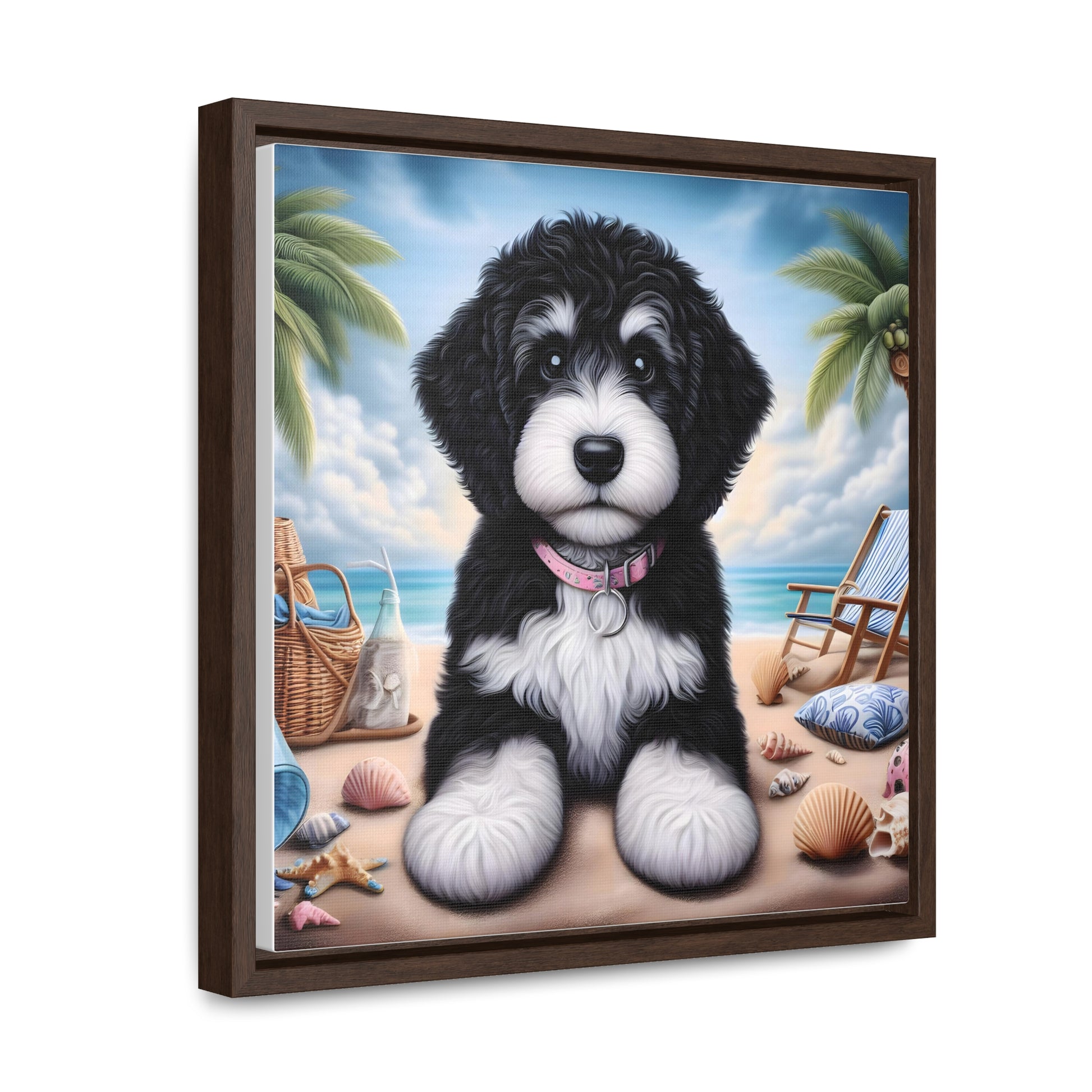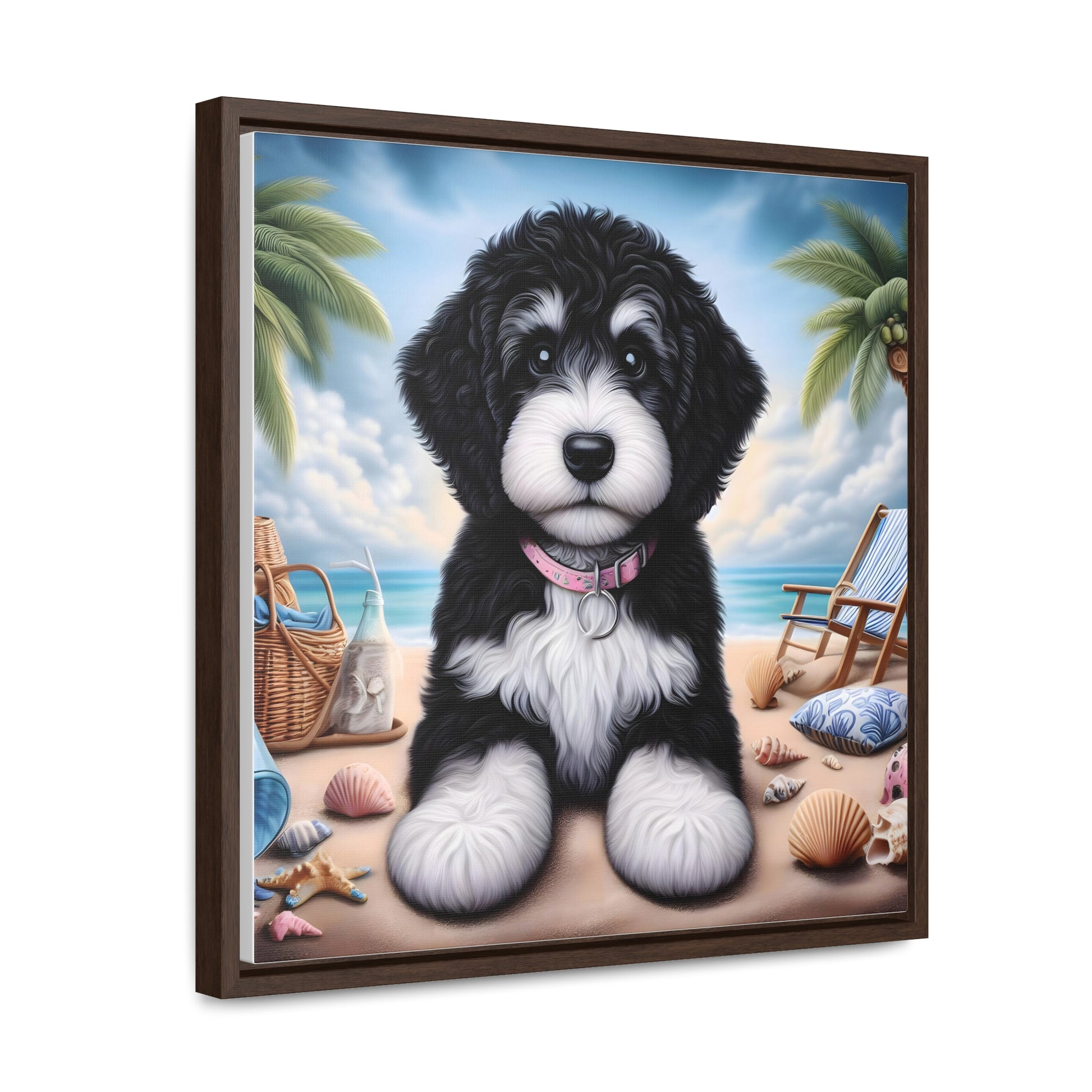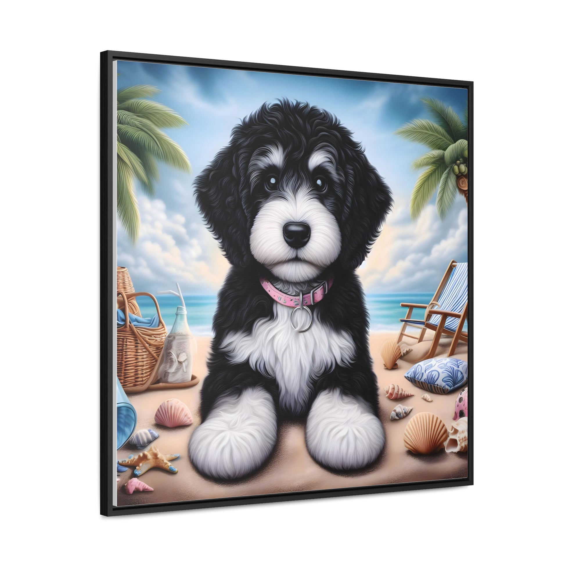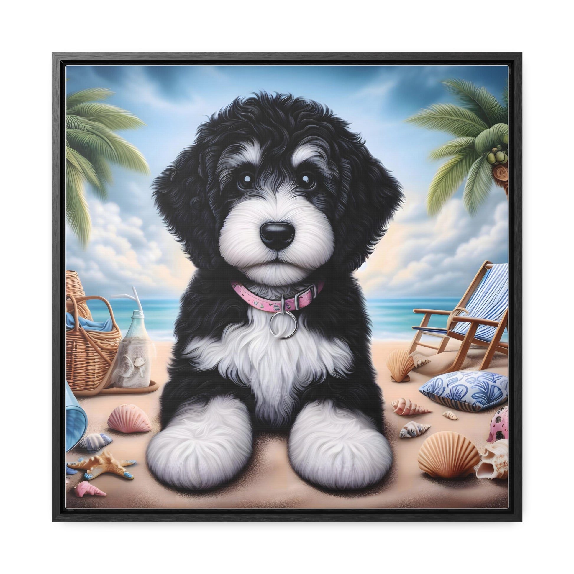 Black & White Doodle Puppy on Beach - Wooden Gallery Canvas Picture - Square Frame - Nice!