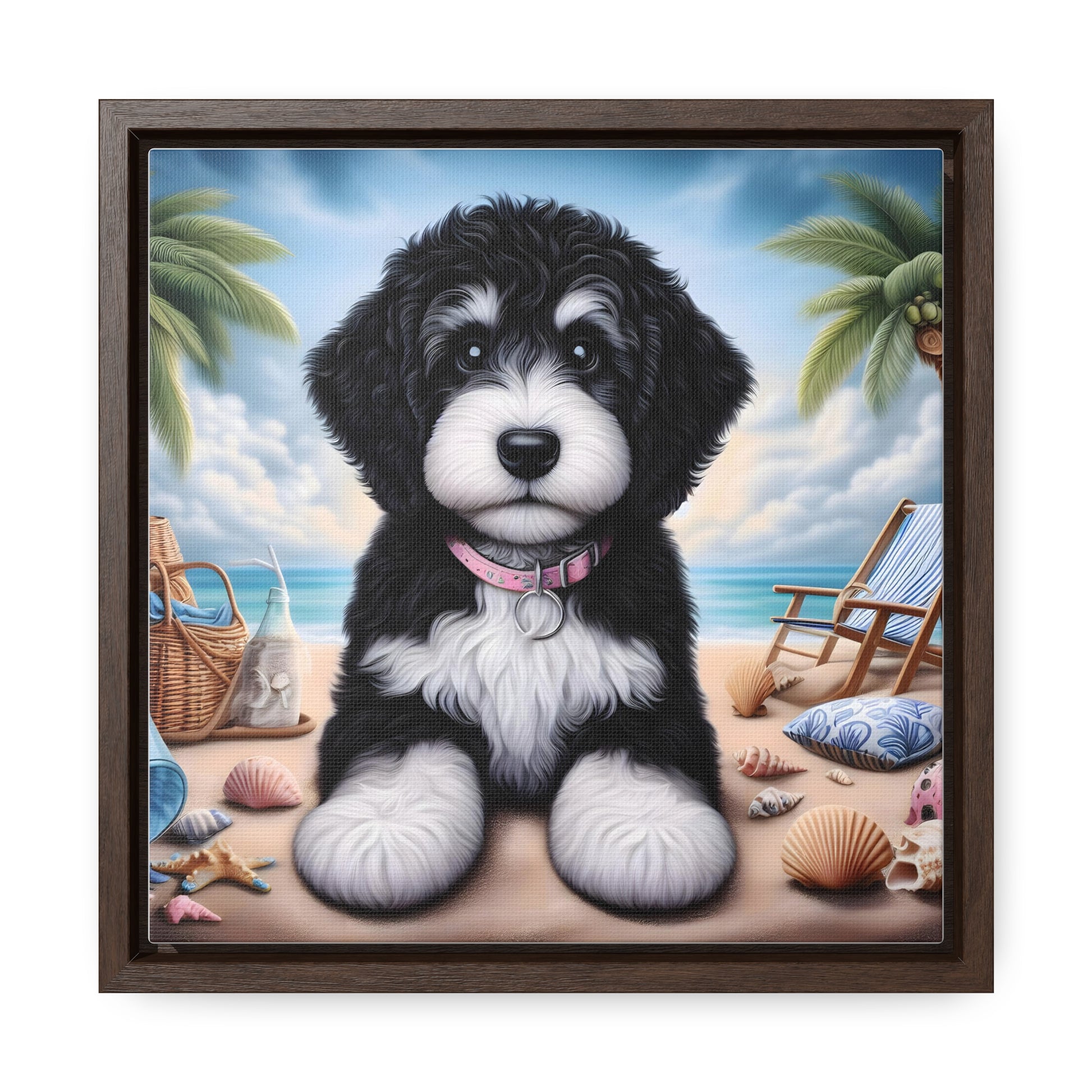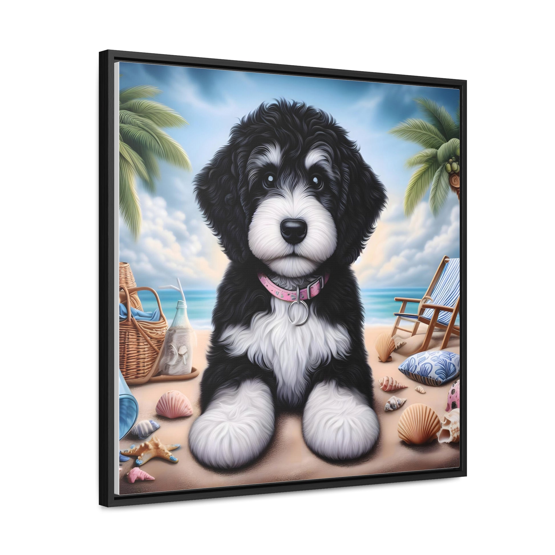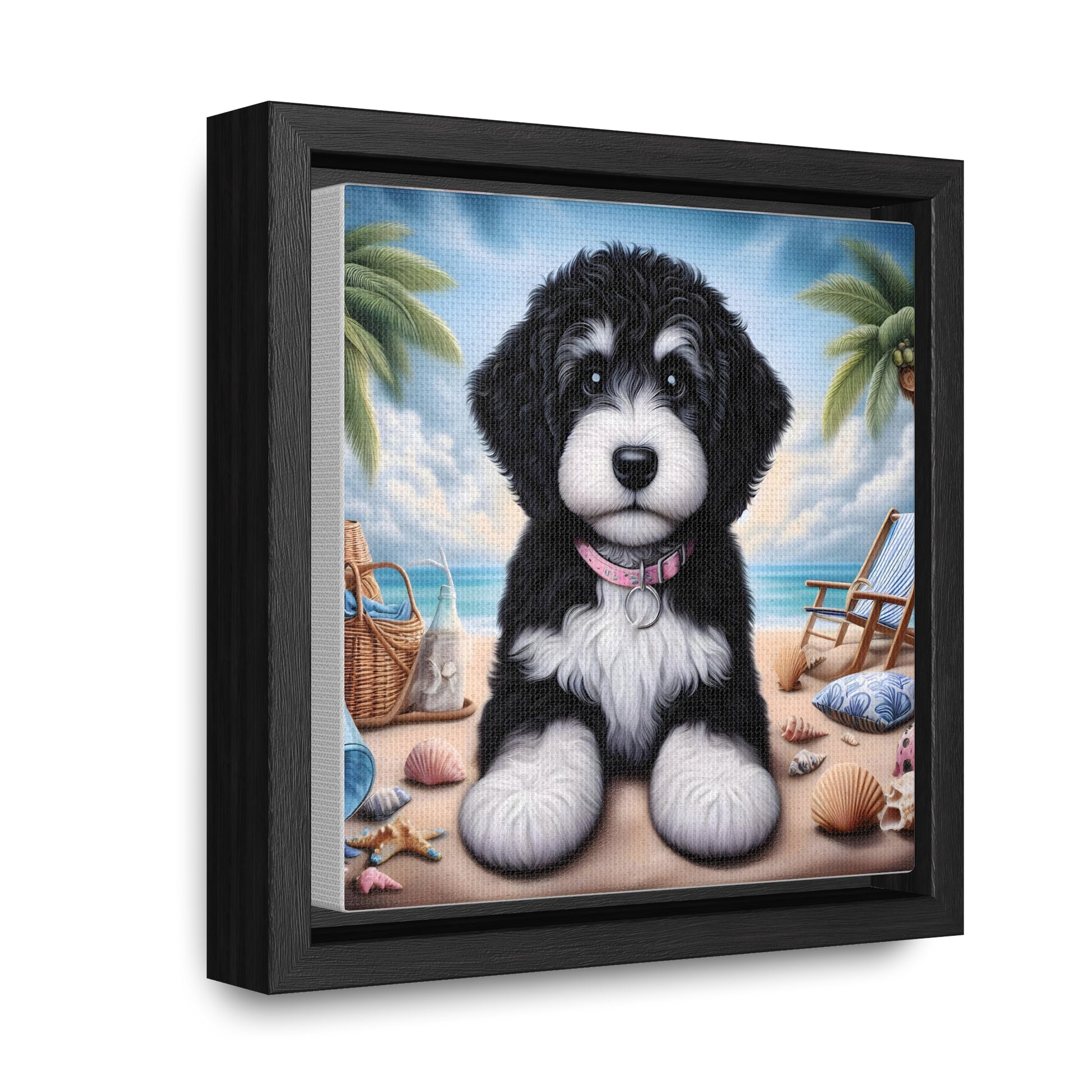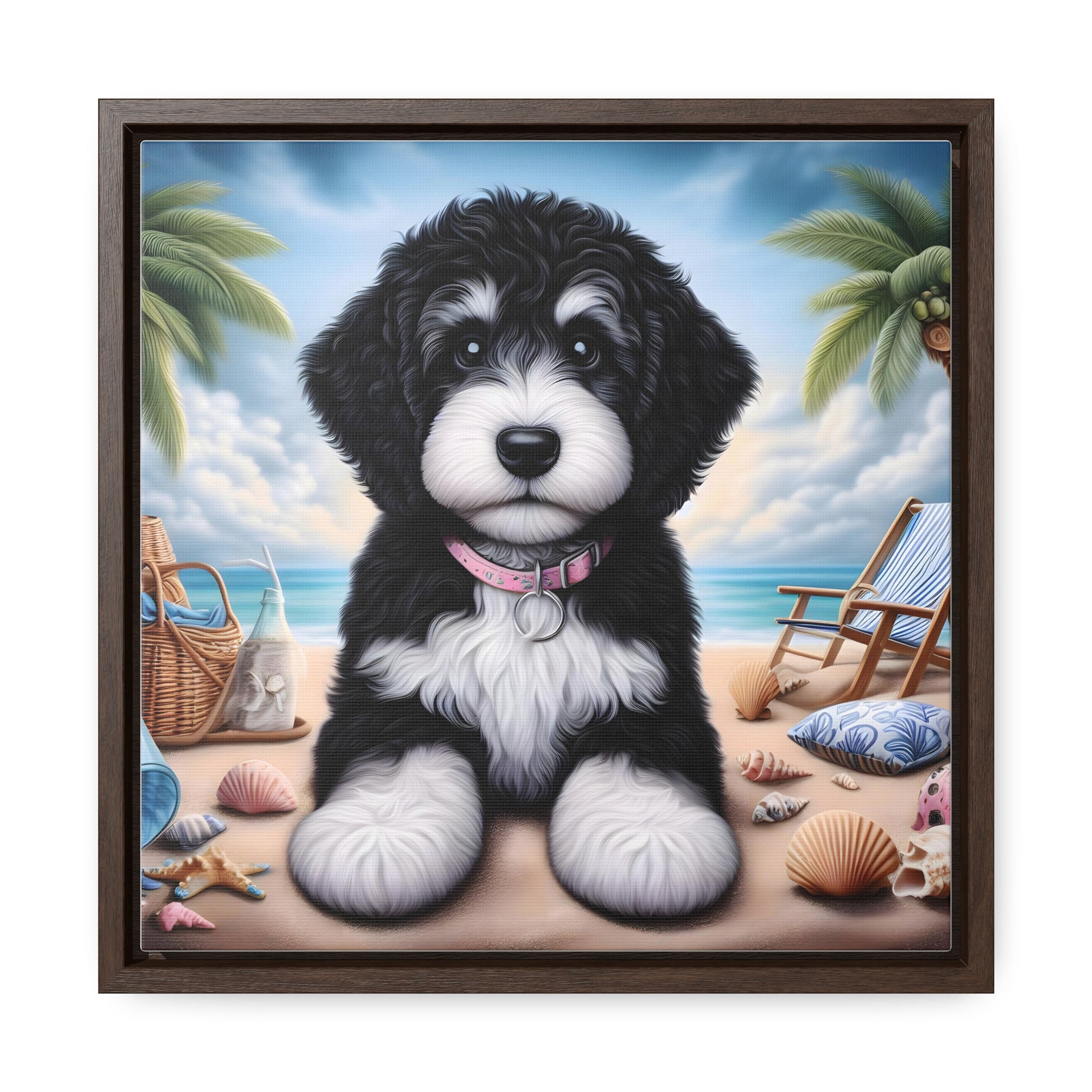 Black & White Doodle Puppy on Beach - Wooden Gallery Canvas Picture - Square Frame - Nice!
