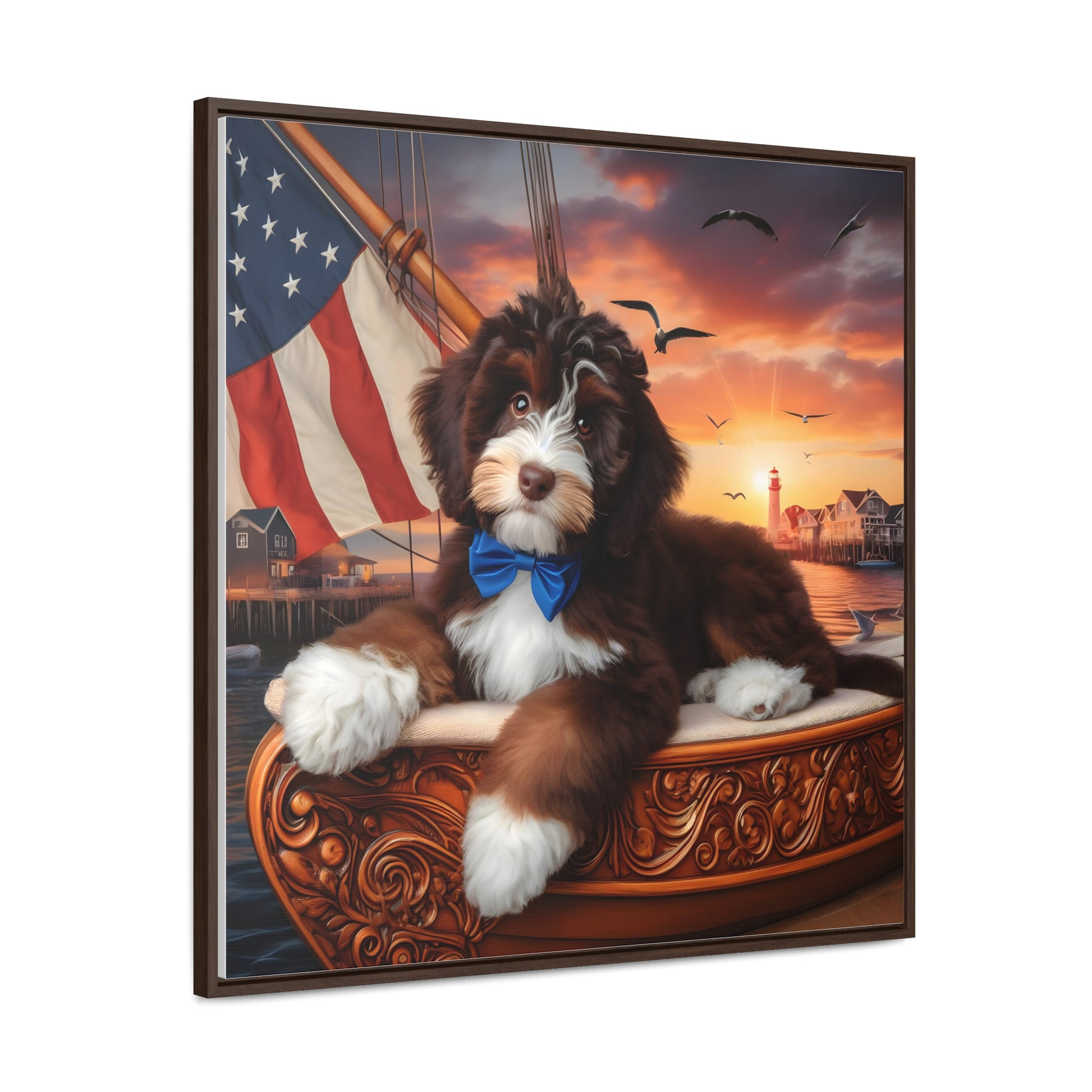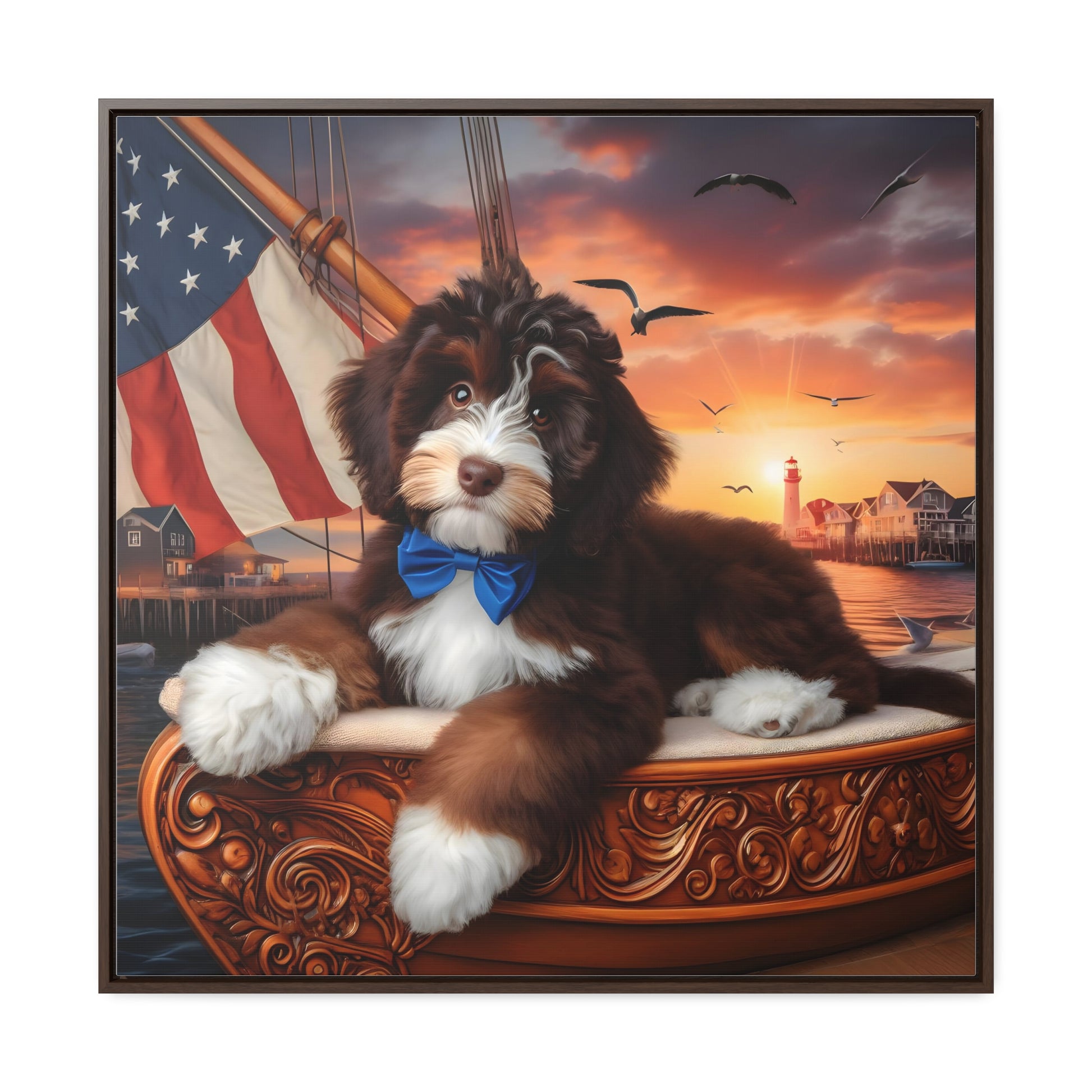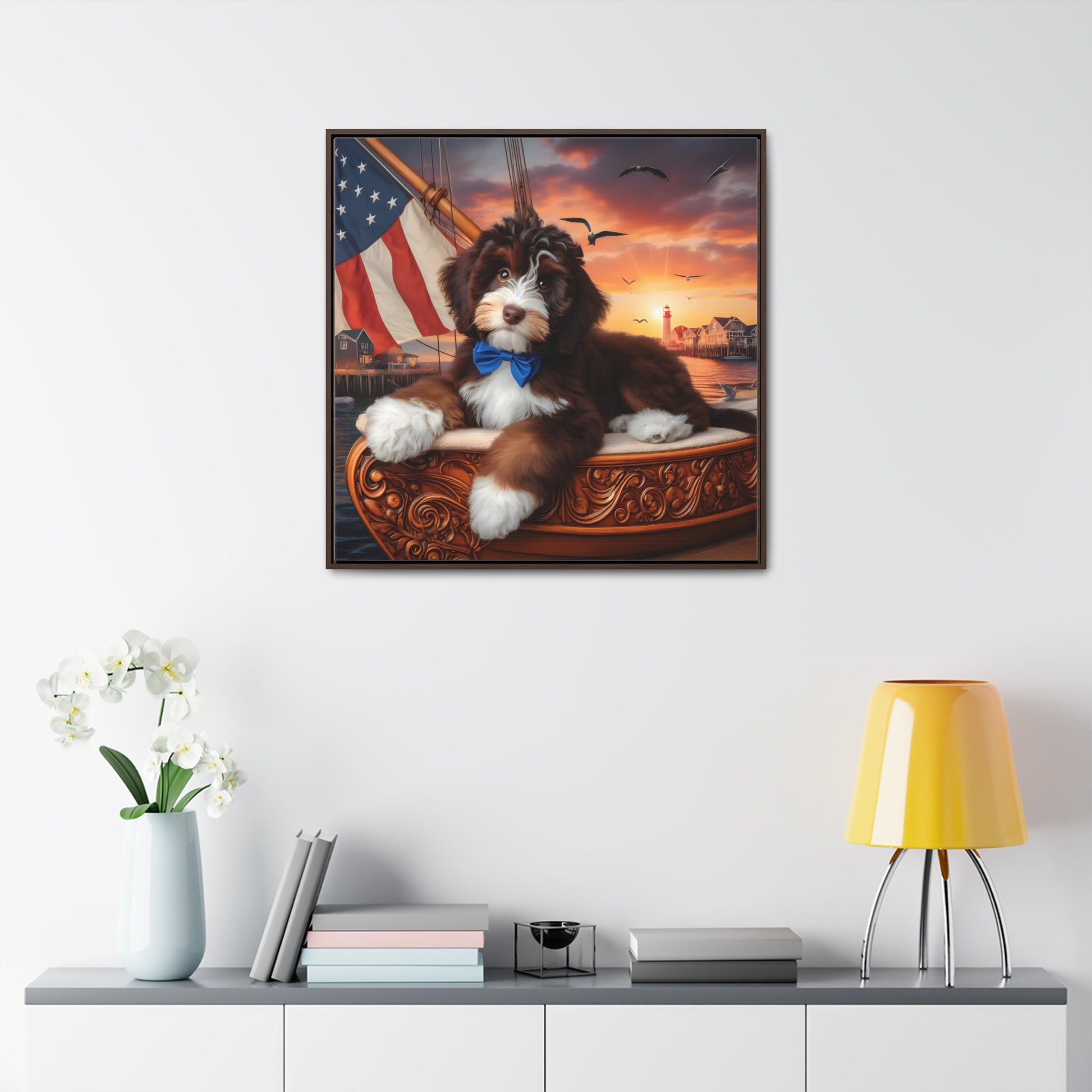 Brown and White Bernedoodle on Sailboat - Wooden Gallery Canvas Picture - Square Frame - Nice!