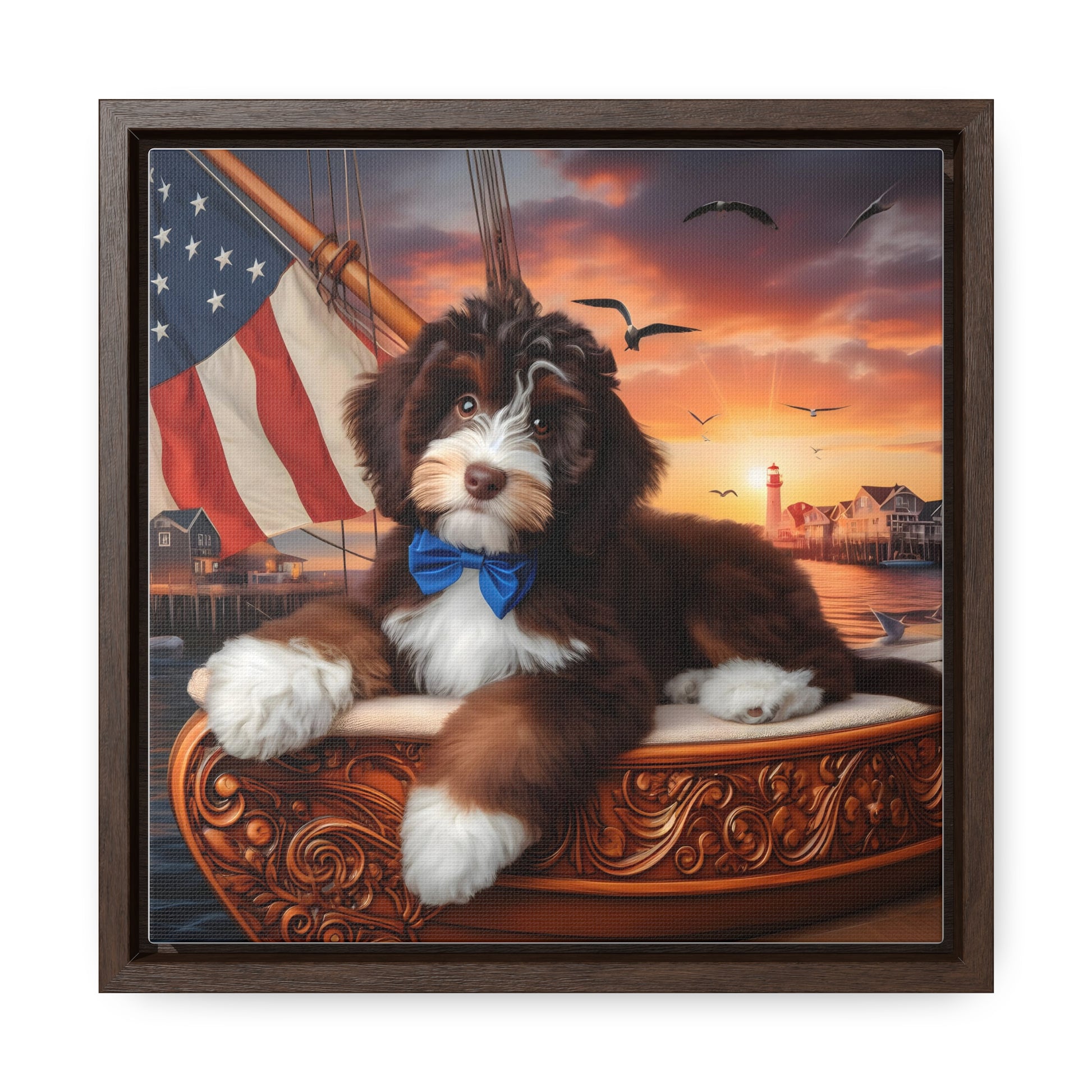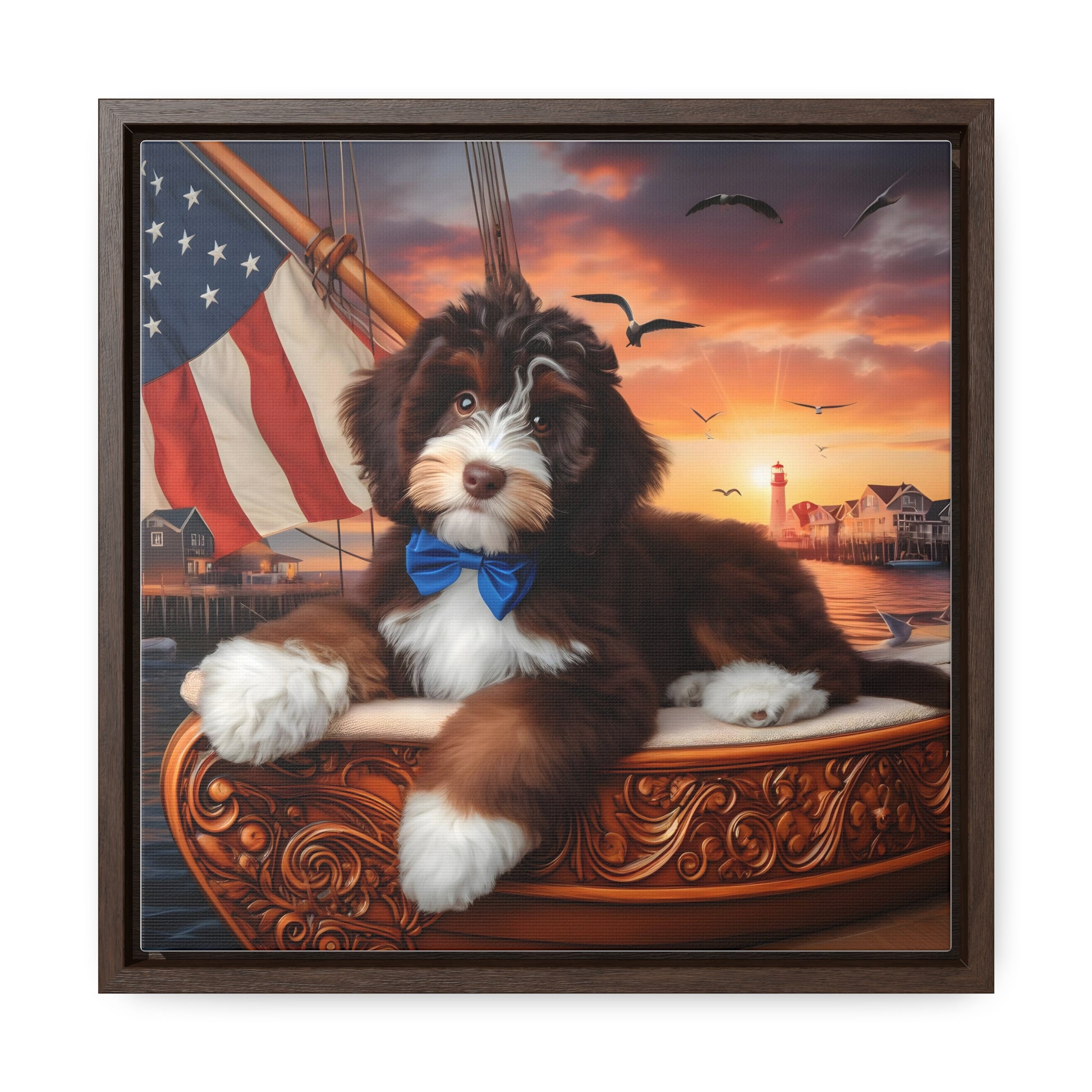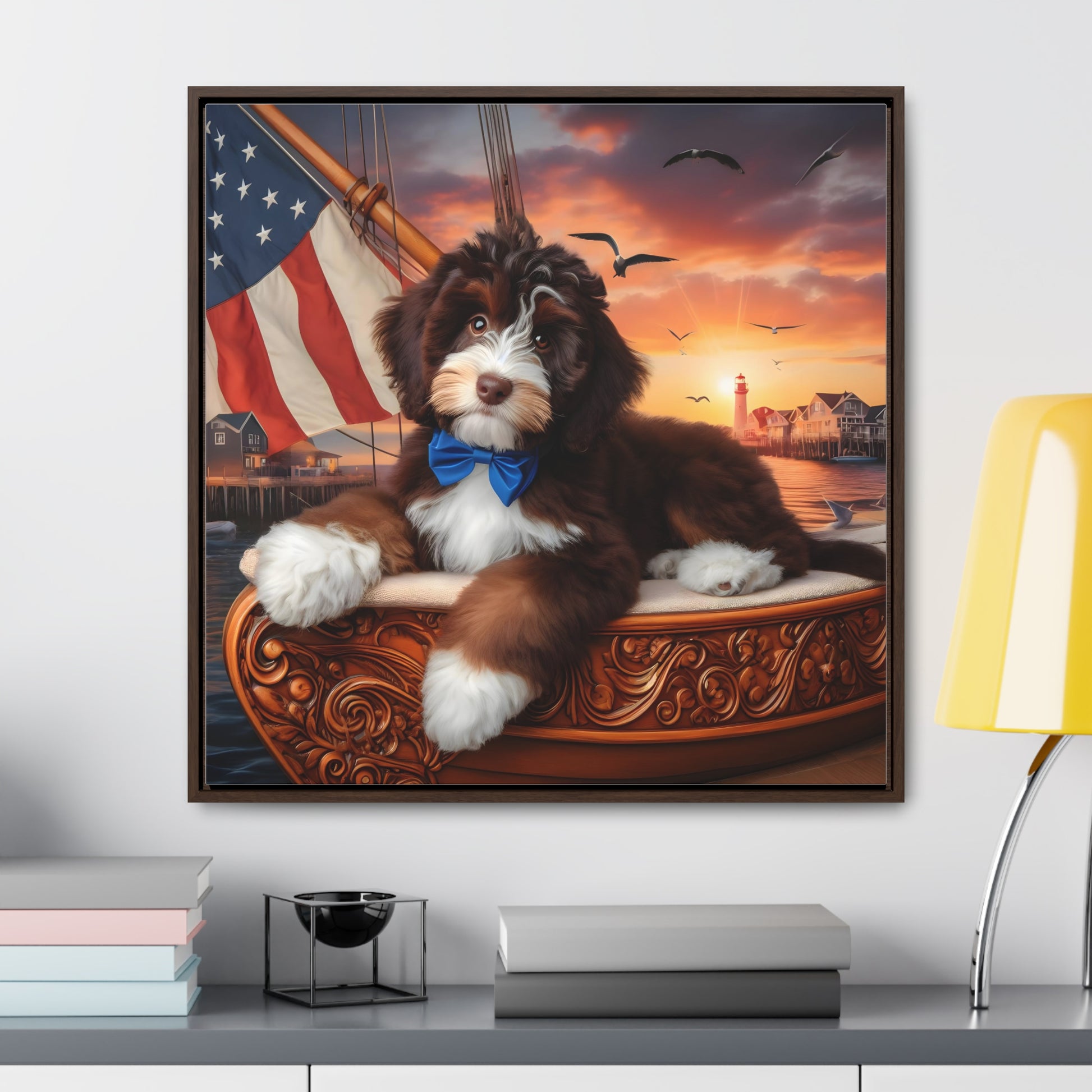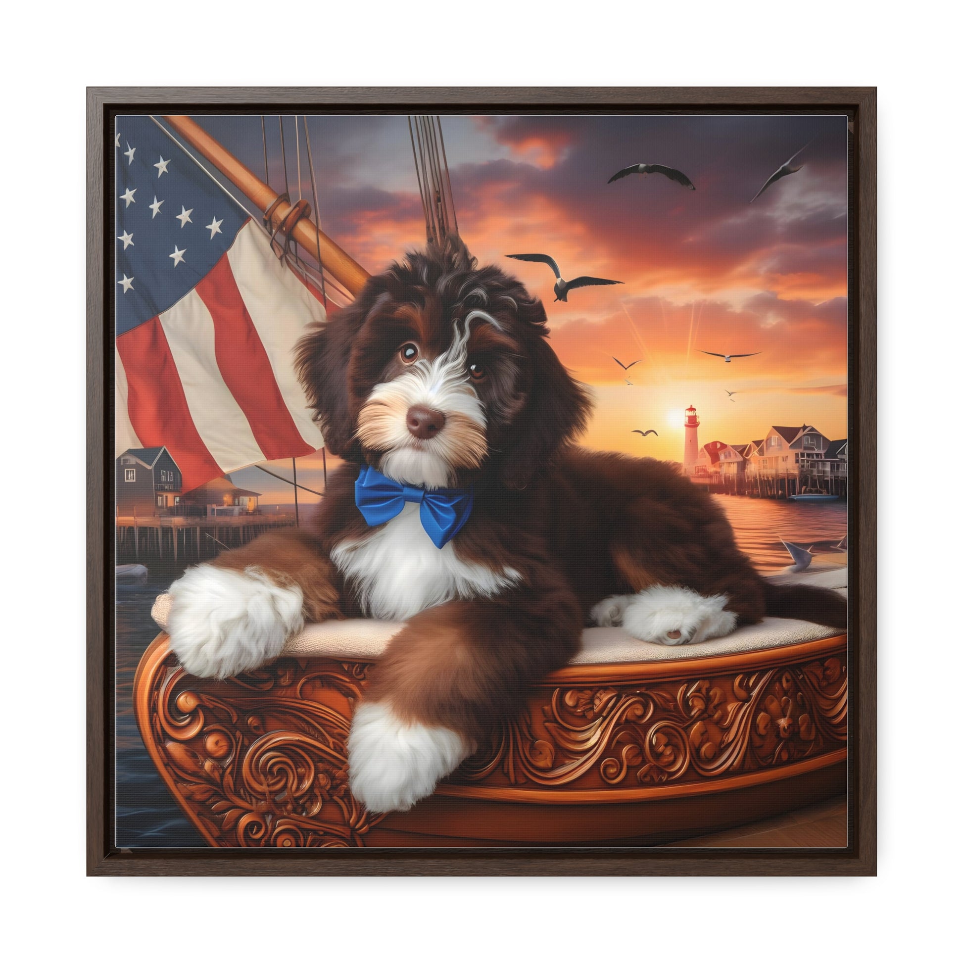 Brown and White Bernedoodle on Sailboat - Wooden Gallery Canvas Picture - Square Frame - Nice!