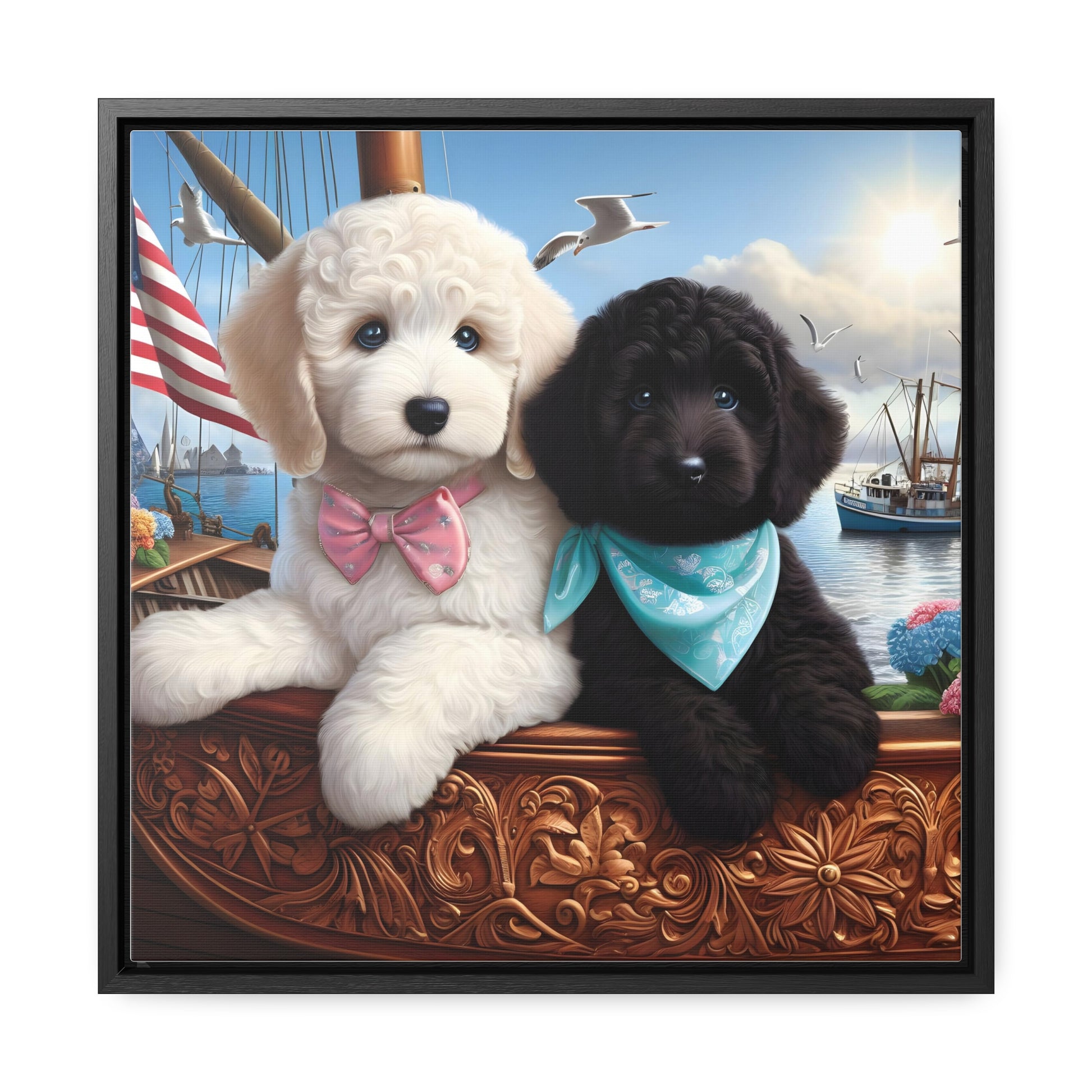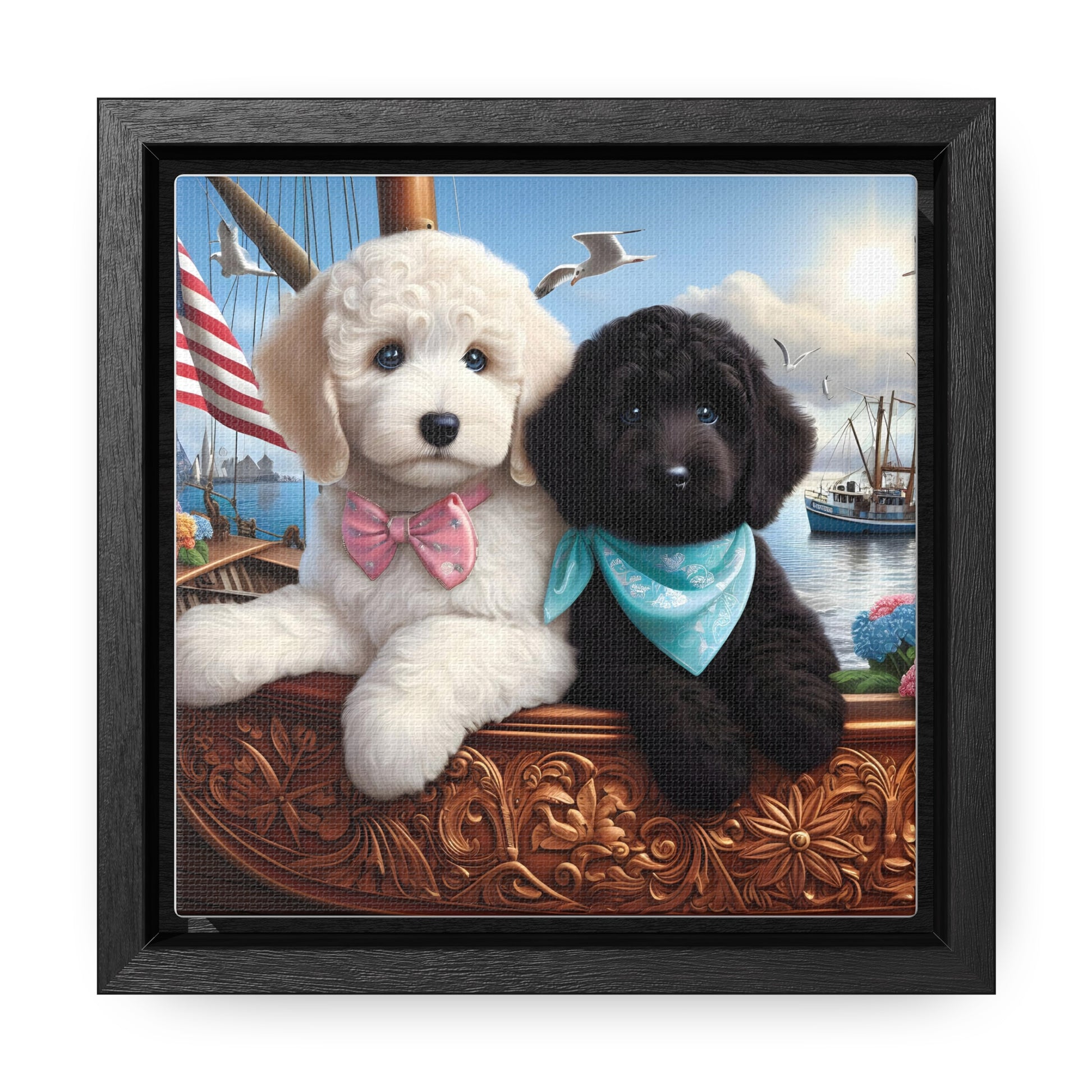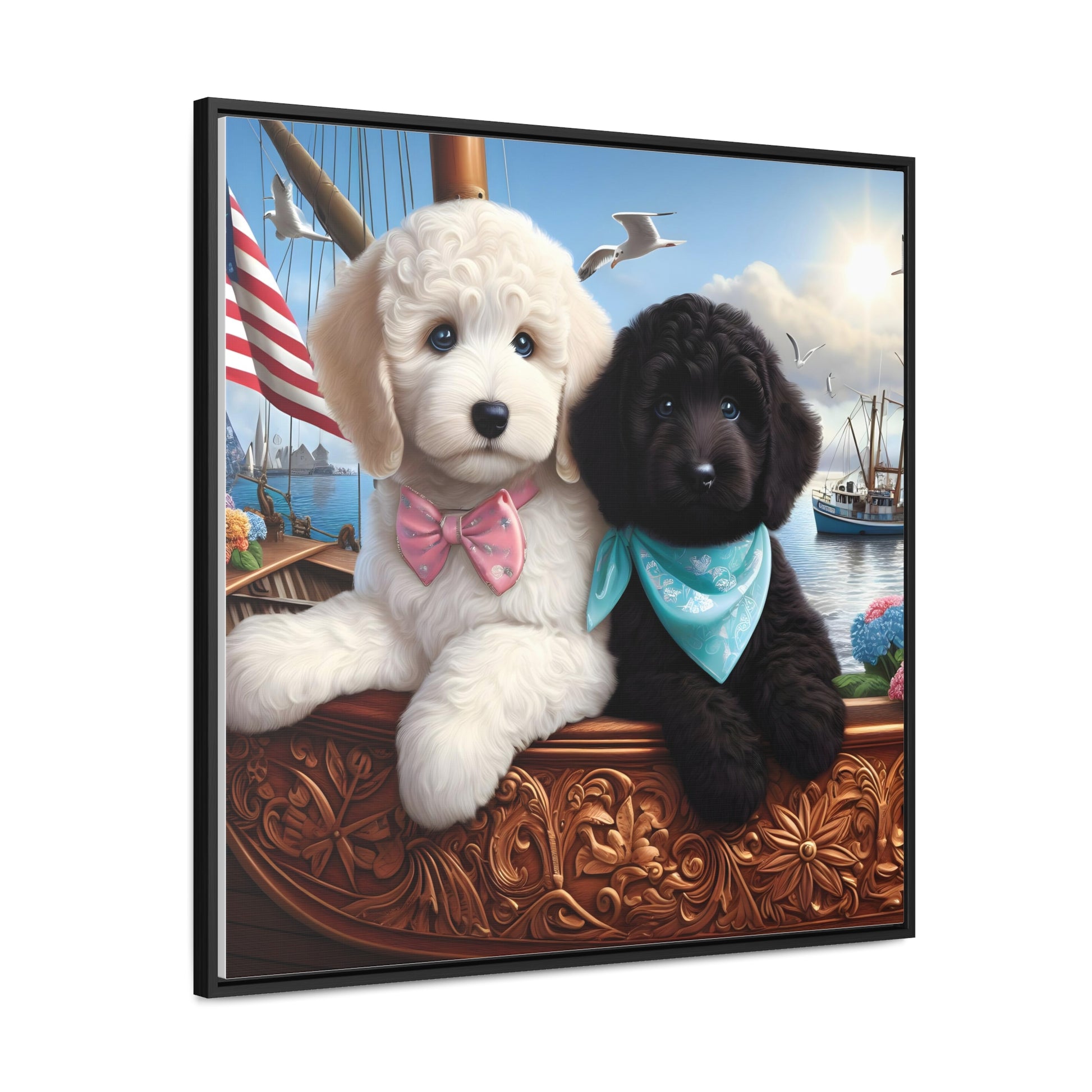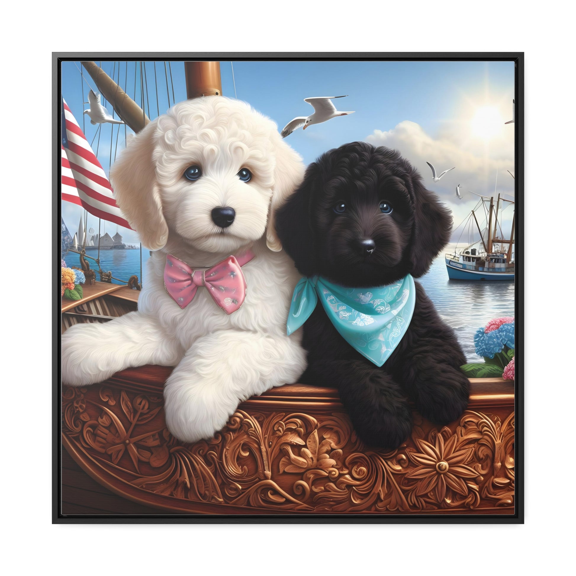 White and Black Doodle on Sailboat - Wooden Gallery Canvas Pictures - Square Frame - Nice!