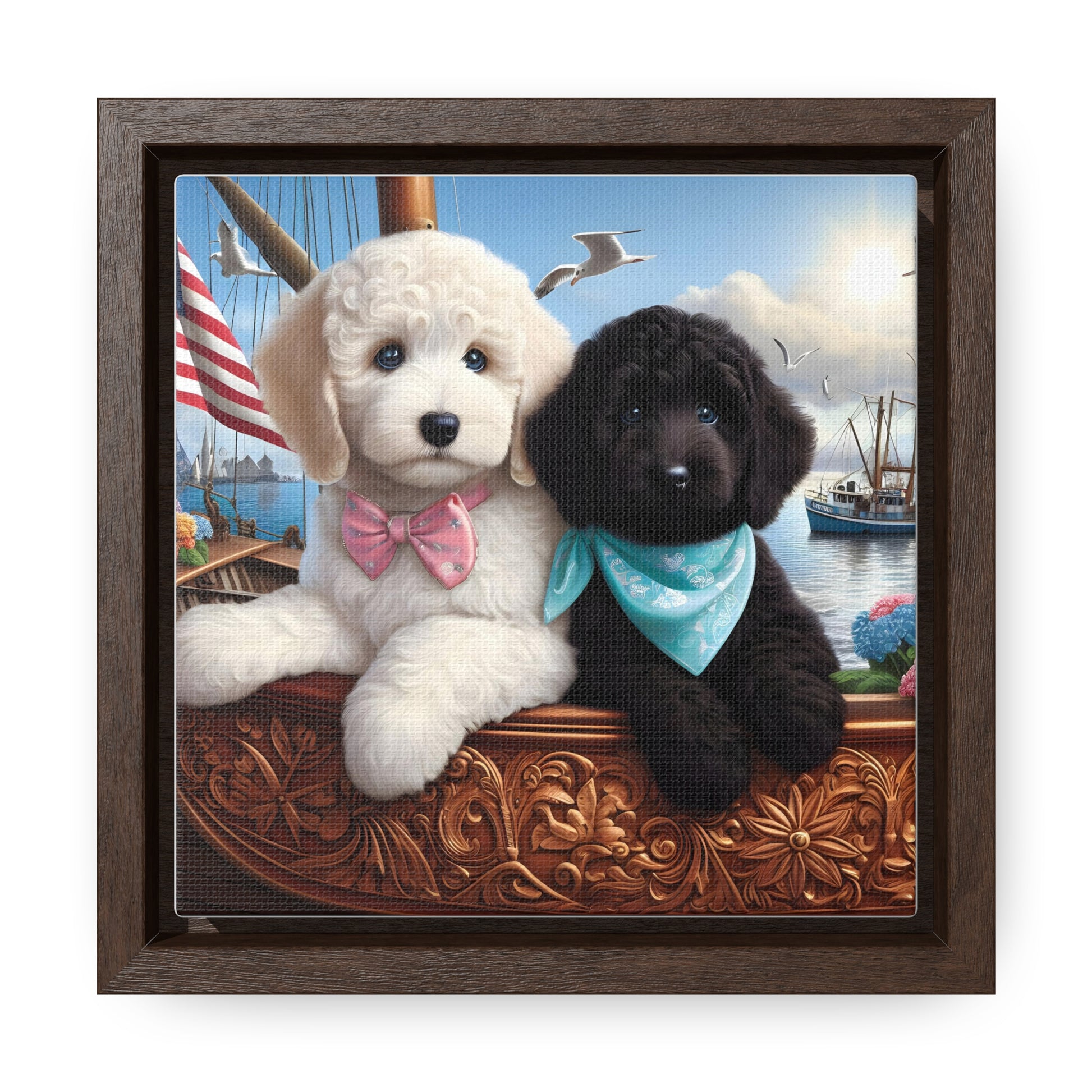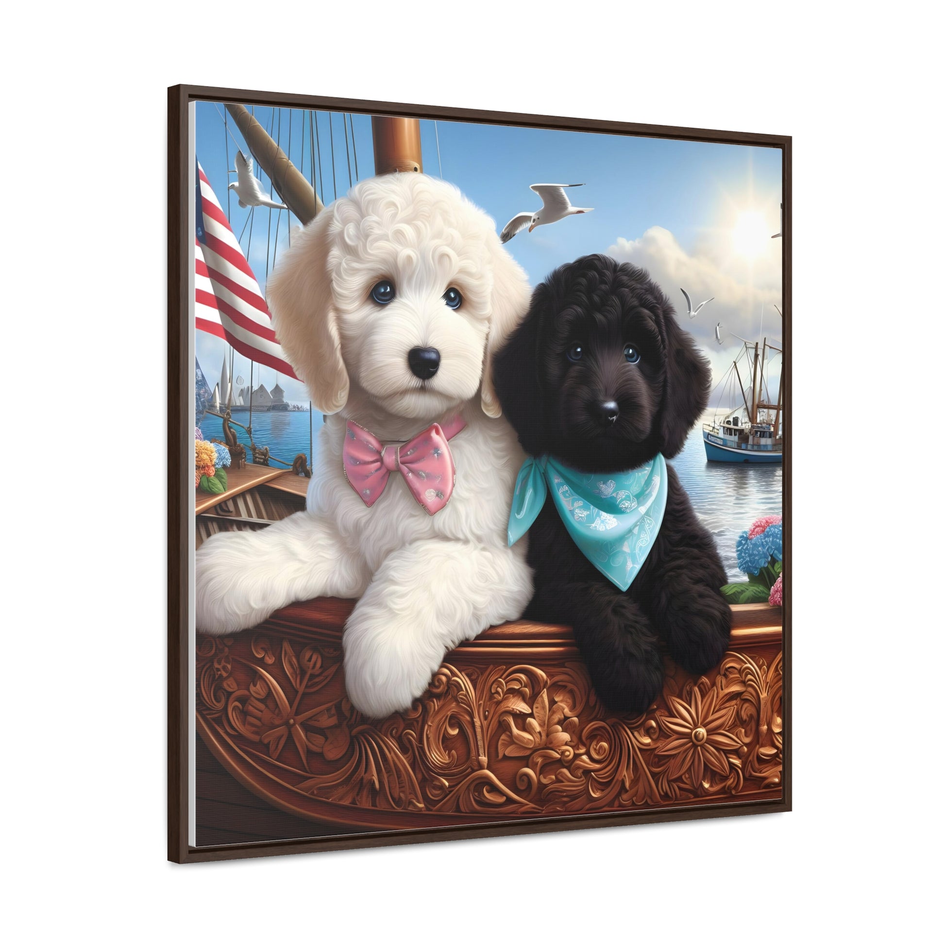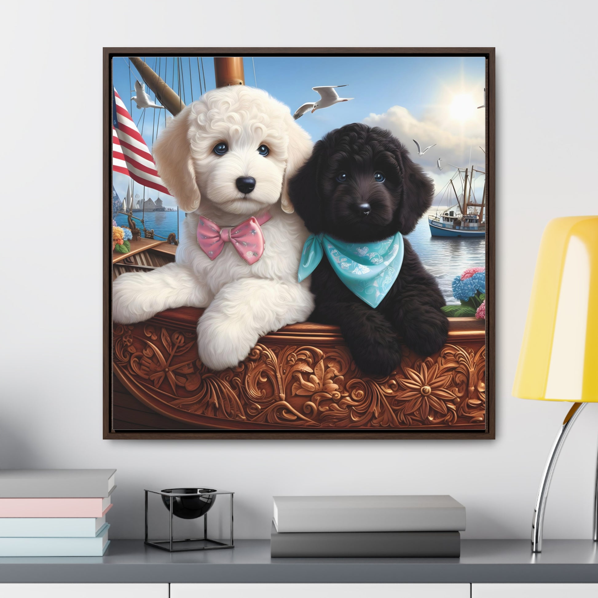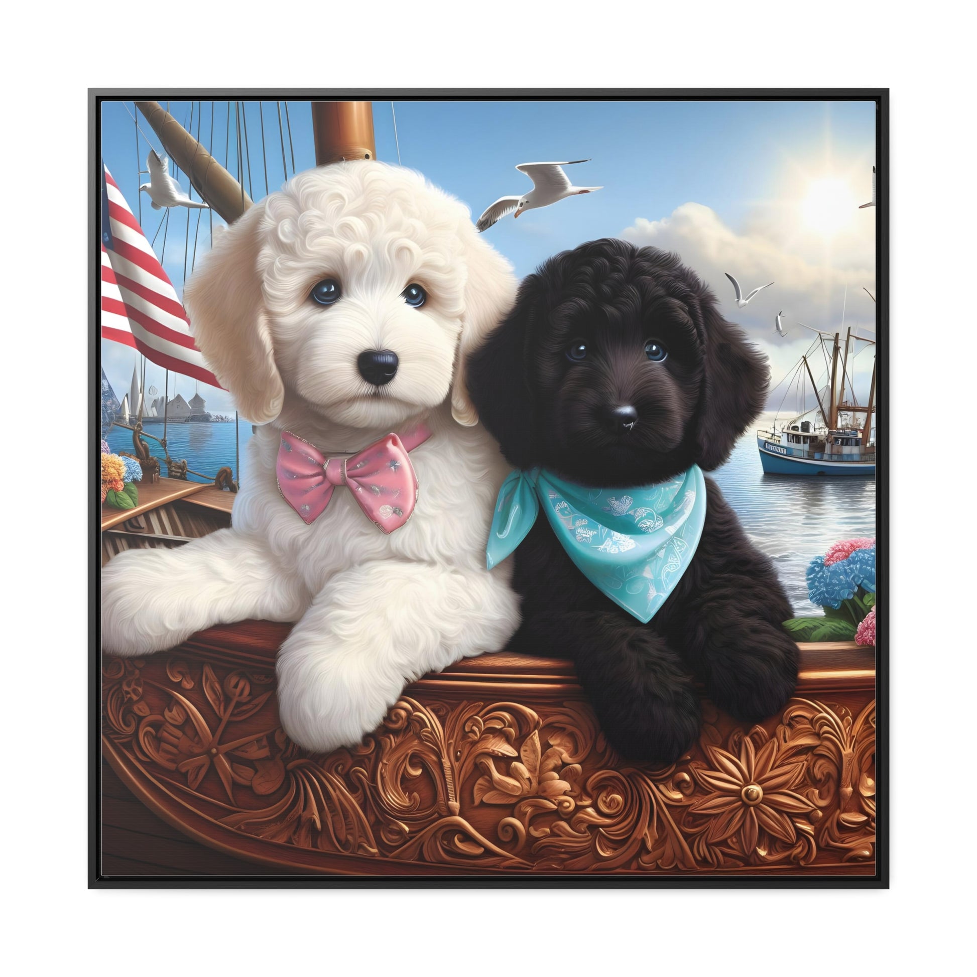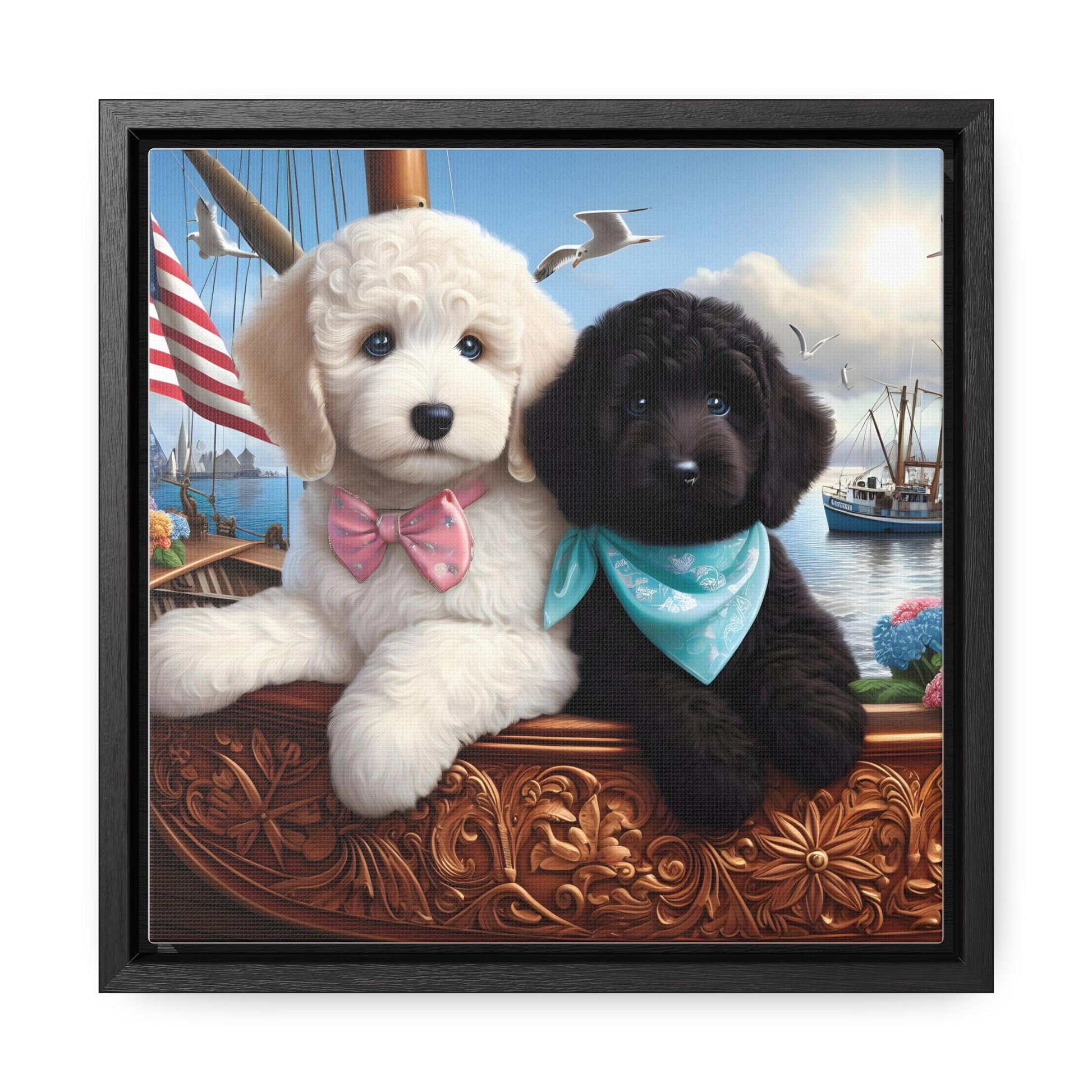 White and Black Doodle on Sailboat - Wooden Gallery Canvas Pictures - Square Frame - Nice!