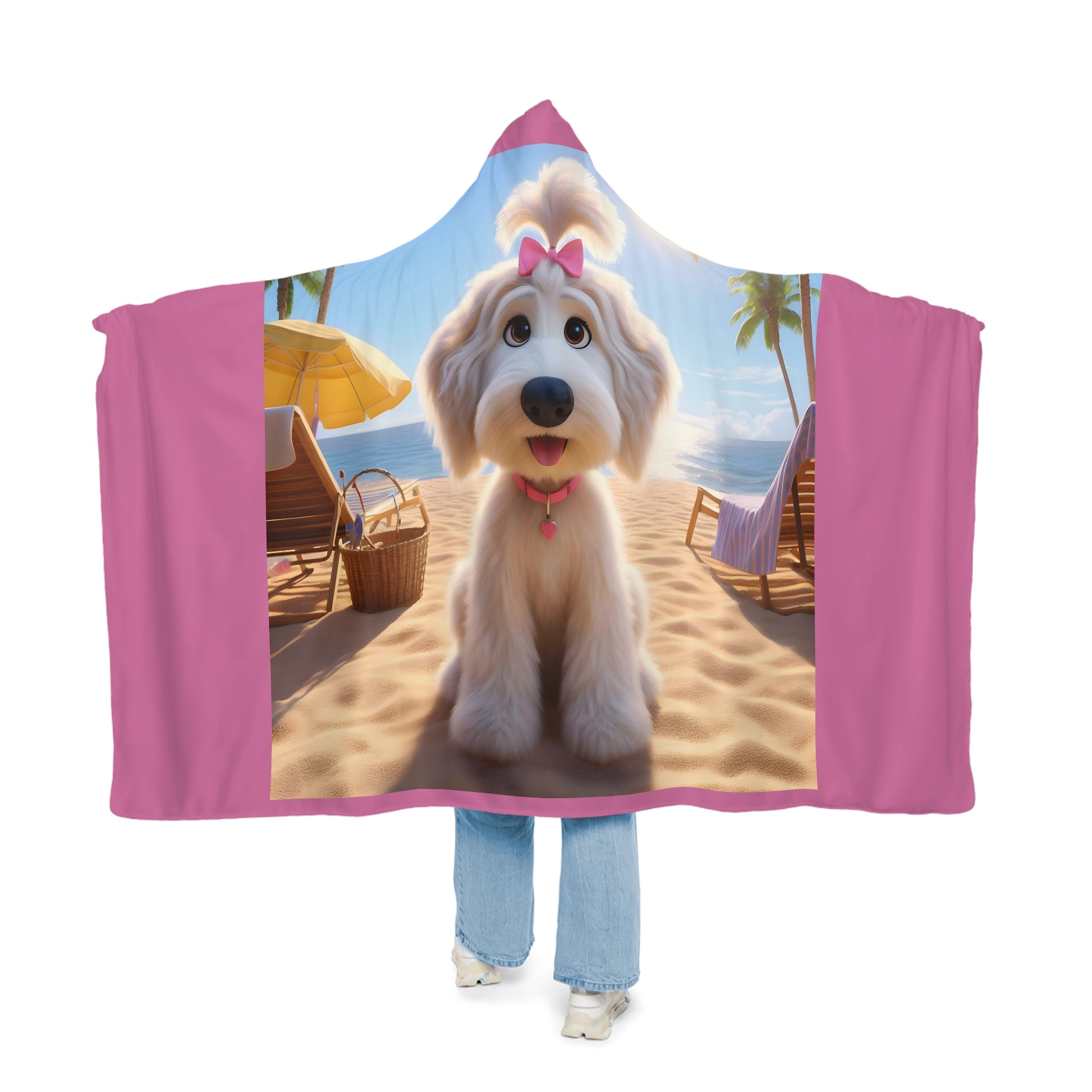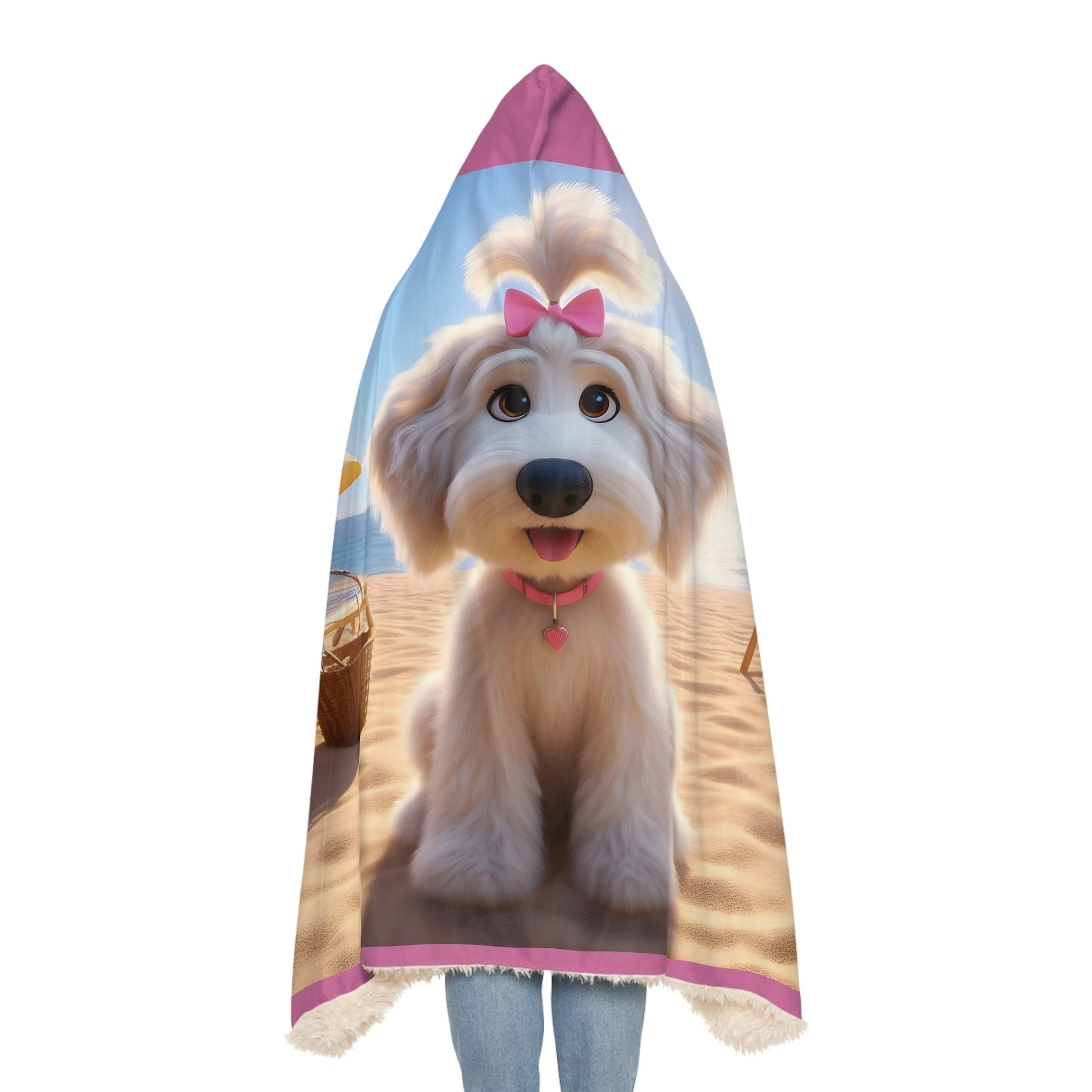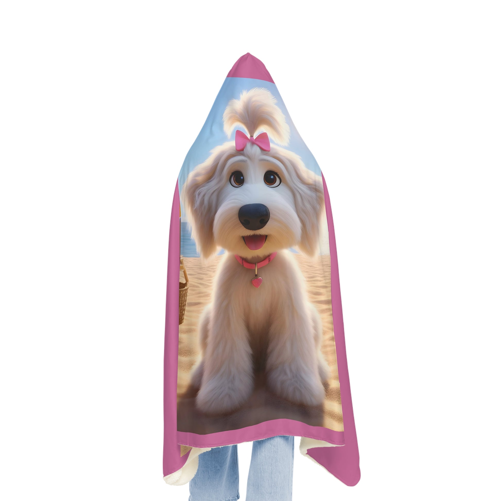 White Doodle Puppy Cartoon Inspired w/Pink Bow Hooded Snuggle Blanket